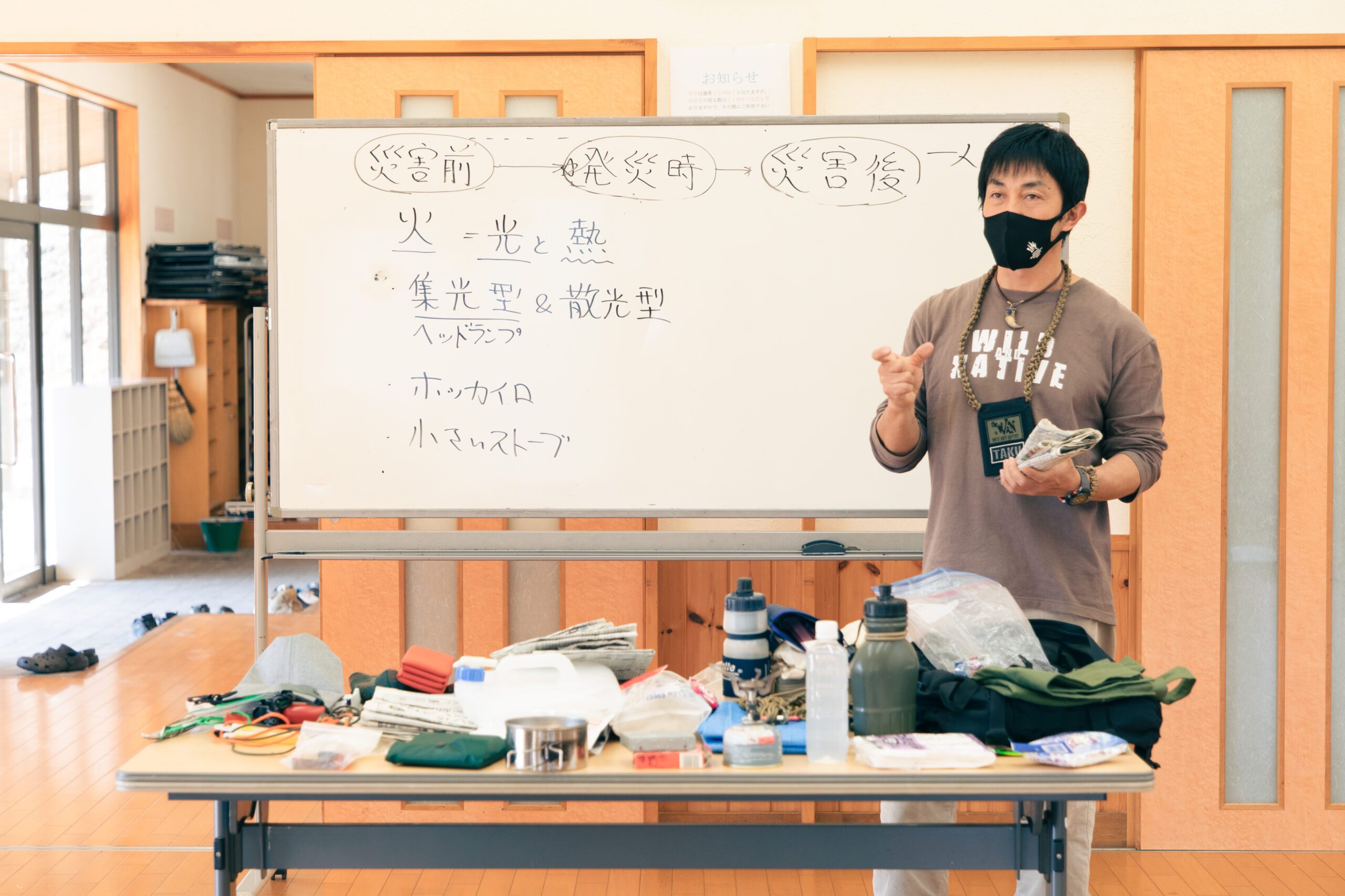 また、「楽しさを通して災害時のサバイバル術を人に伝える術」も学びます。